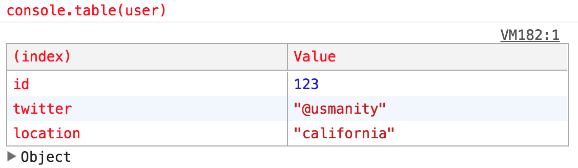 You can print this in an easy to ready format by using console.table() like console.table(user) and it’ll display like this: