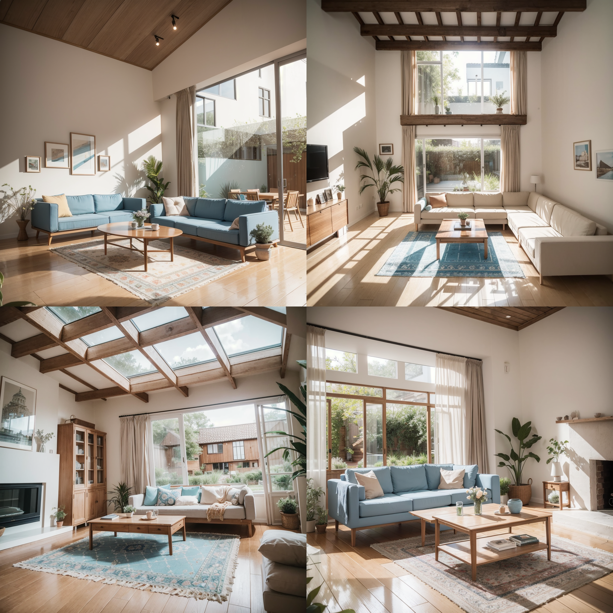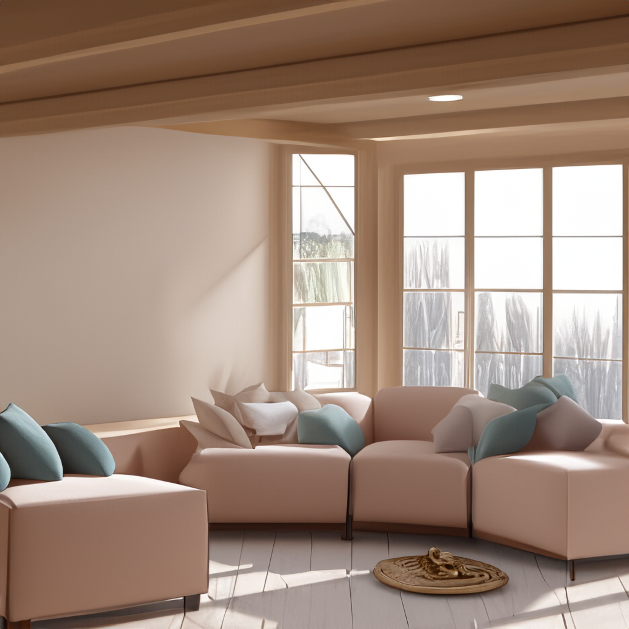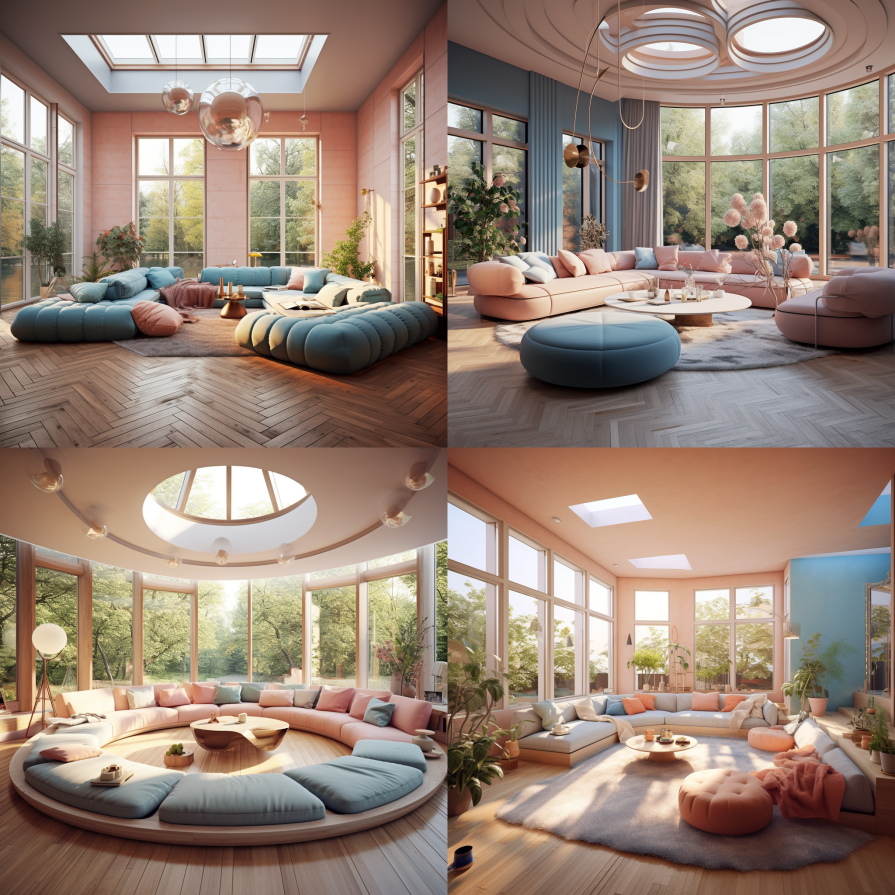 High resolution photography interior design, dreamy sunken living room conversation pit, wooden floor, small windows opening onto the garden, bauhaus furniture and decoration, high ceiling, beige blue salmon pastel palette, interior design magazine, cozy atmosphere; 8k, intricate detail, photorealistic, realistic light, wide angle, kinkfolk photography, A+D architecture
