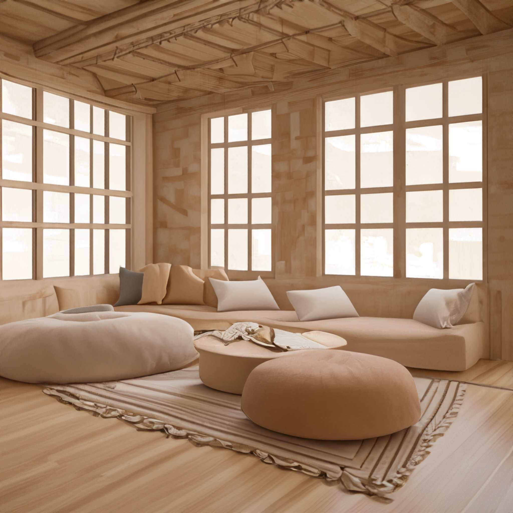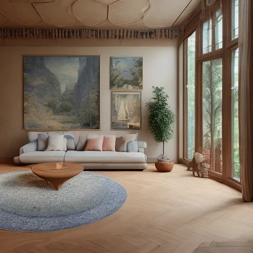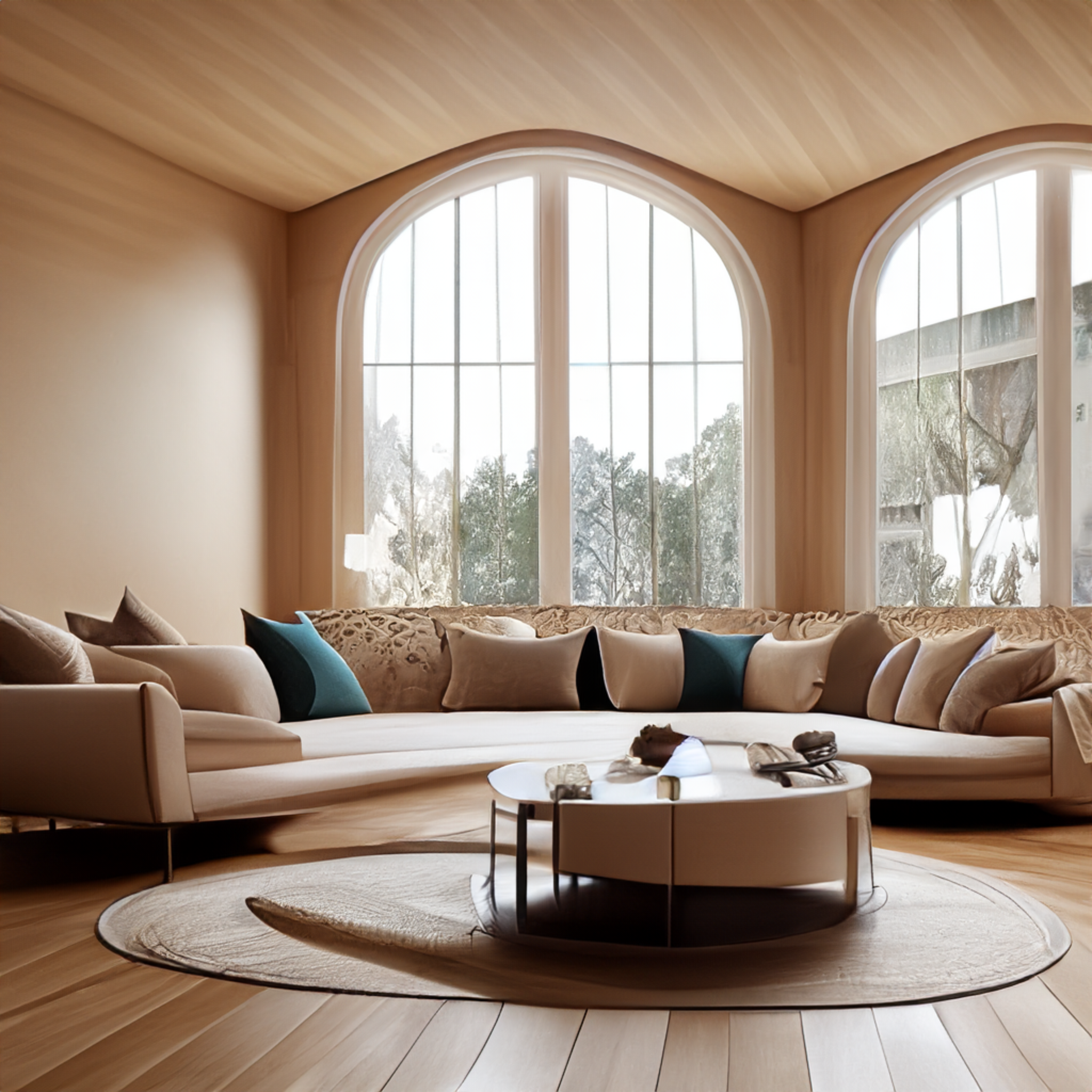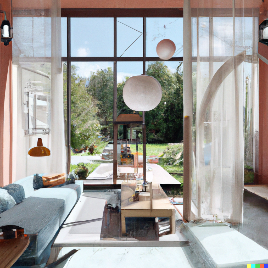 High resolution photography interior design, dreamy sunken living room conversation pit, wooden floor, small windows opening onto the garden, bauhaus furniture and decoration, high ceiling, beige blue salmon pastel palette, interior design magazine, cozy atmosphere; 8k, intricate detail, photorealistic, realistic light, wide angle, kinkfolk photography, A+D architecture