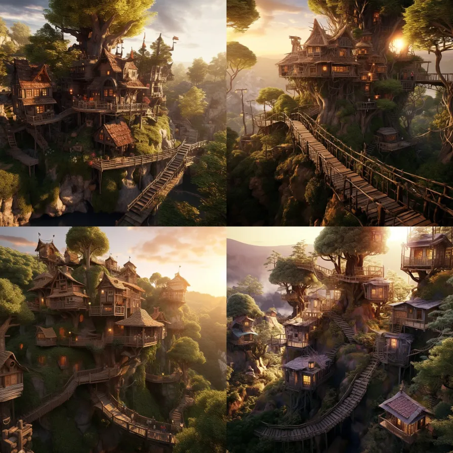 valley, fairytale treehouse village covered, matte painting, highly detailed, dynamic lighting, cinematic, realism, realistic, photo real, sunset,detailed, high contrast, denoised, centered