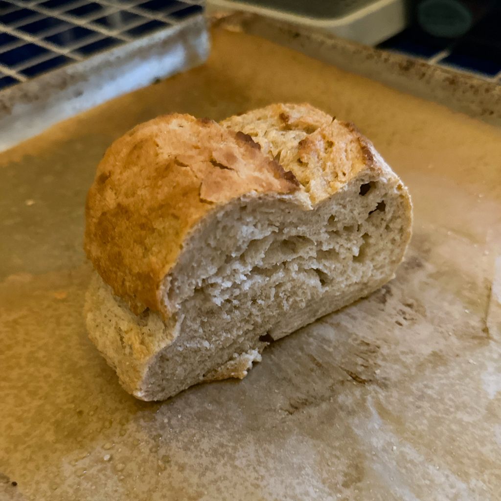 I messed up a lot. I didn't really follow a set of instructions and I didn't think about how long to rest it with more dough. There was no salt 😢. It tasted a bit too doughy and not done all the way. But I did come up with a name for my starter "Dough Vinci". I will have to try again tomorrow.