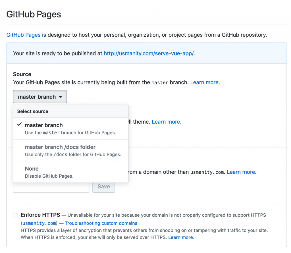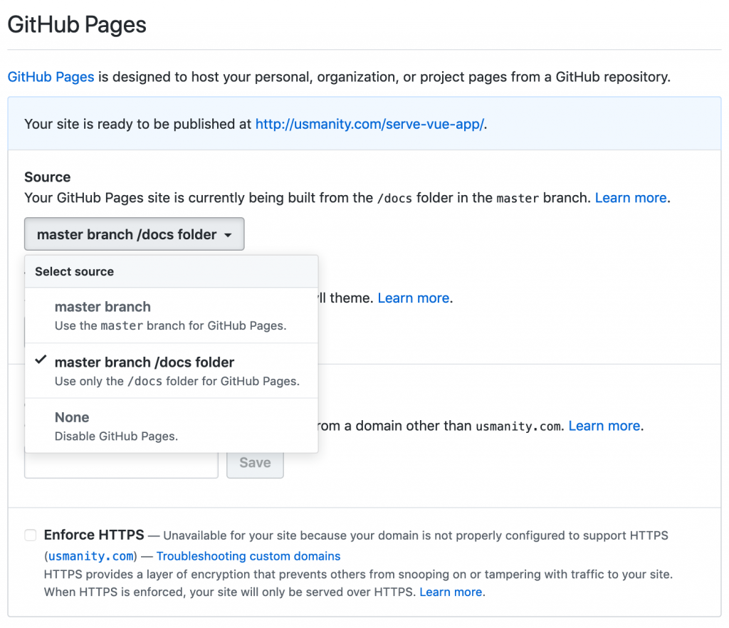 I wanted to share a pretty simple setup on how to serve a Vue.js app using Github Pages. I’m writing this because I had to search around online for awhile before I stumbled upon the Vue.js docs and then had to play with some settings in Github.