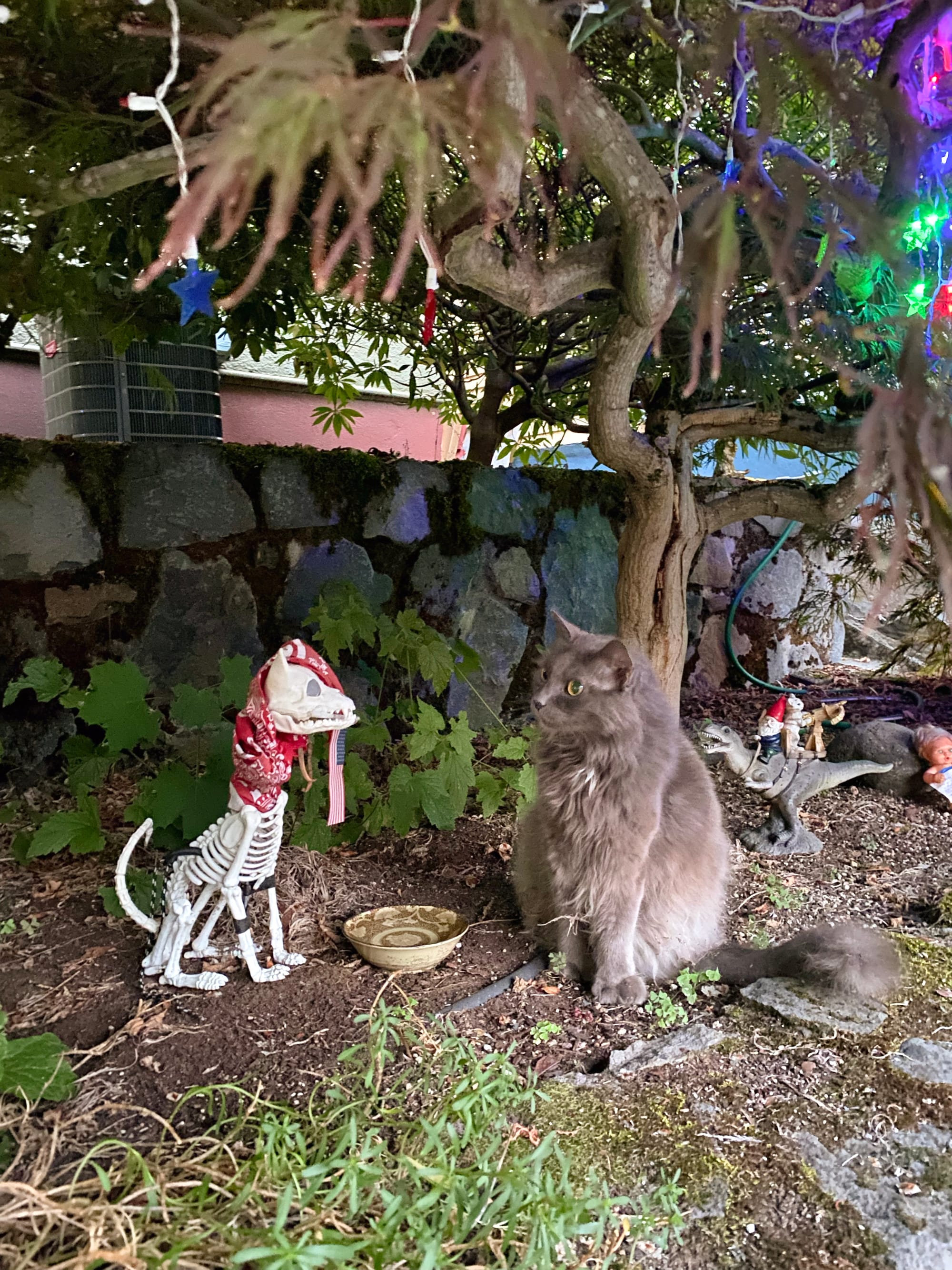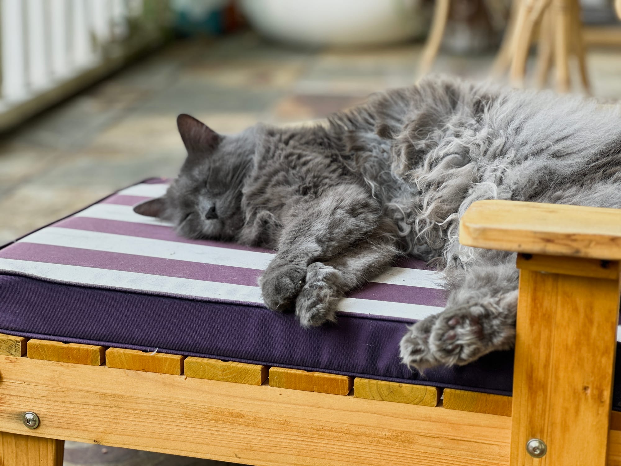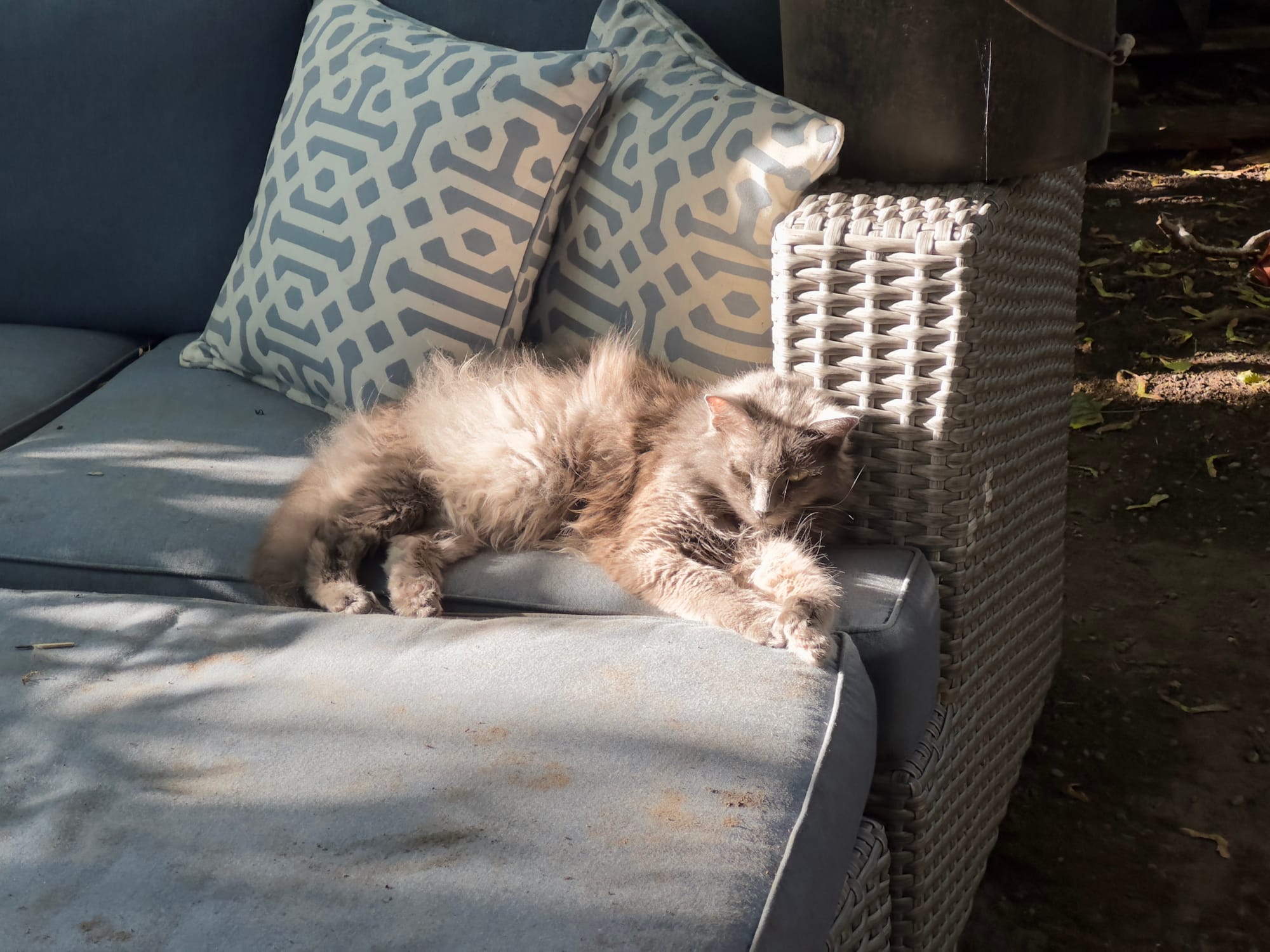 She goes out to our neighbor's house and lays under their bush. Which works well with her gray coat and during the hot days, it protects her from the sun while still being very warm. Just recently, I've realized that cats love being warm or at least warmer than humans.