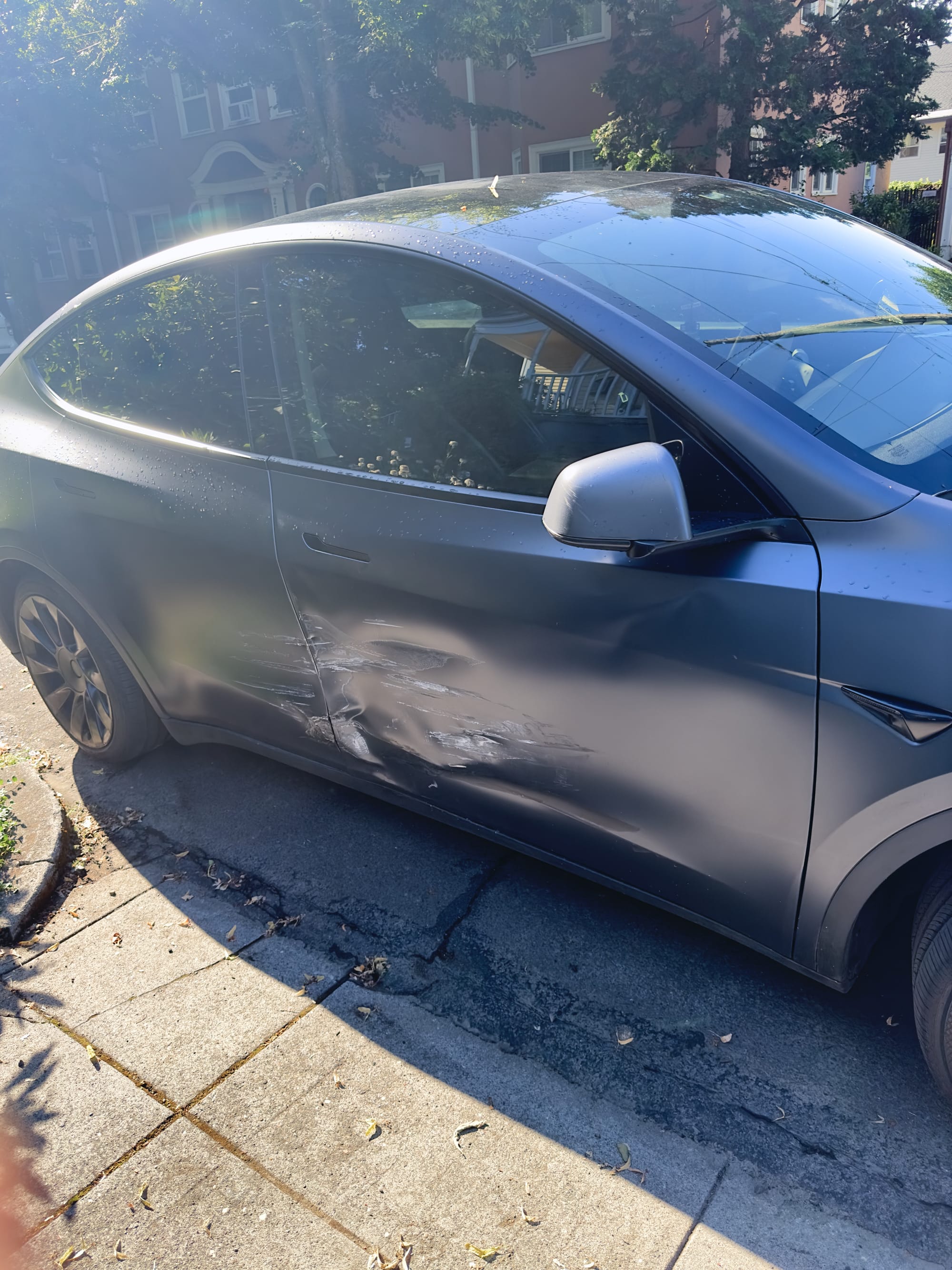 Last month, while driving downtown, Kristen got into a car accident. She and everyone else involved are completely okay so that's great. Our car, it's not doing so well so it has been sitting at the body shop for weeks now. The people who ran into her were tourists and they most likely weren't familiar with Portland streets, especially being downtown where bus lanes and bike lanes appear and disappear without much notice. Here's a photo of our car's damage: