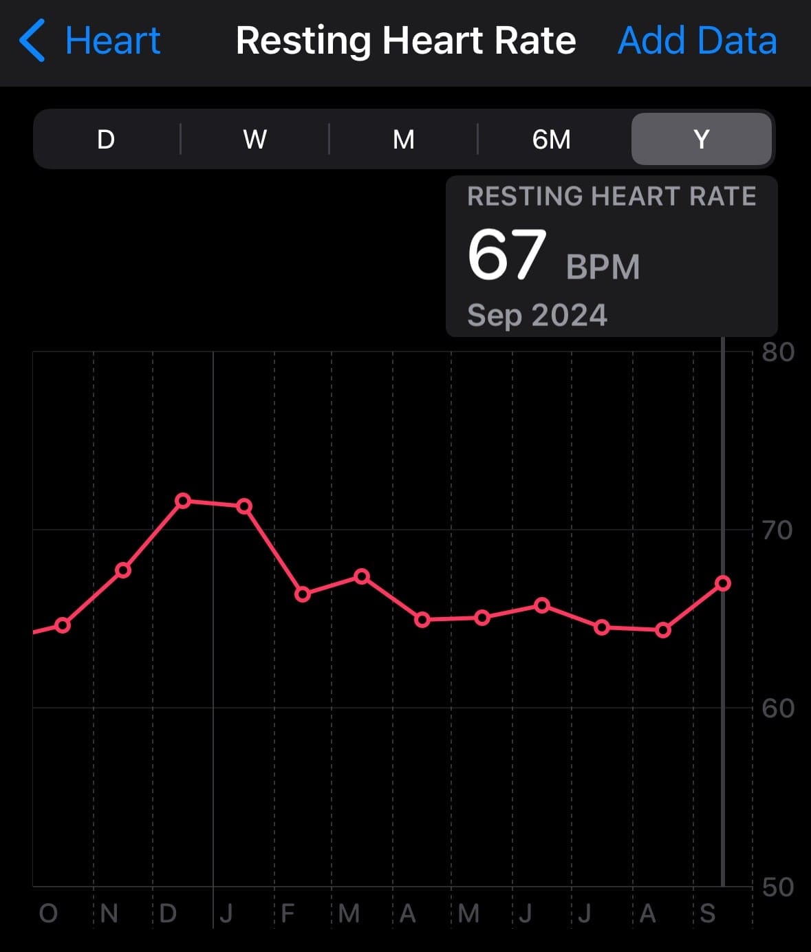 Now is a good time to check in on my resting heart rate goal of under 60 bpm. It isn't anywhere close to that but it's been moving in the right direction. September has been mostly me sitting at home. The lowest so far was August at 64. I'm hoping to work on improving the resting heart rate as it's a decently good indicator of my overall health.