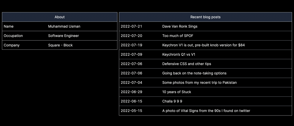 The next.js version was deployed to Vercel, which was a move away from Github, for no reason except that it was “different”. The deployments were smooth because I wasn’t introducing anything major but at one point, someone I was chatting with mentioned they couldn’t access my homepage and I was surprised that they had even tried to go to my homepage and equally surprised they couldn’t see it. So I checked and yup, there was a 500 error being thrown. It was clearly my fault, I was unable to get the blog posts to show up which caused the next.js app to throw an error while running getServerSideProps. So while fixing that error, I ran into the second issue that bothered me with this homepage, it was hard to develop. The experience required me to install the dependencies on any computer I was using and also have a build process (a strong reason why I used vercel).